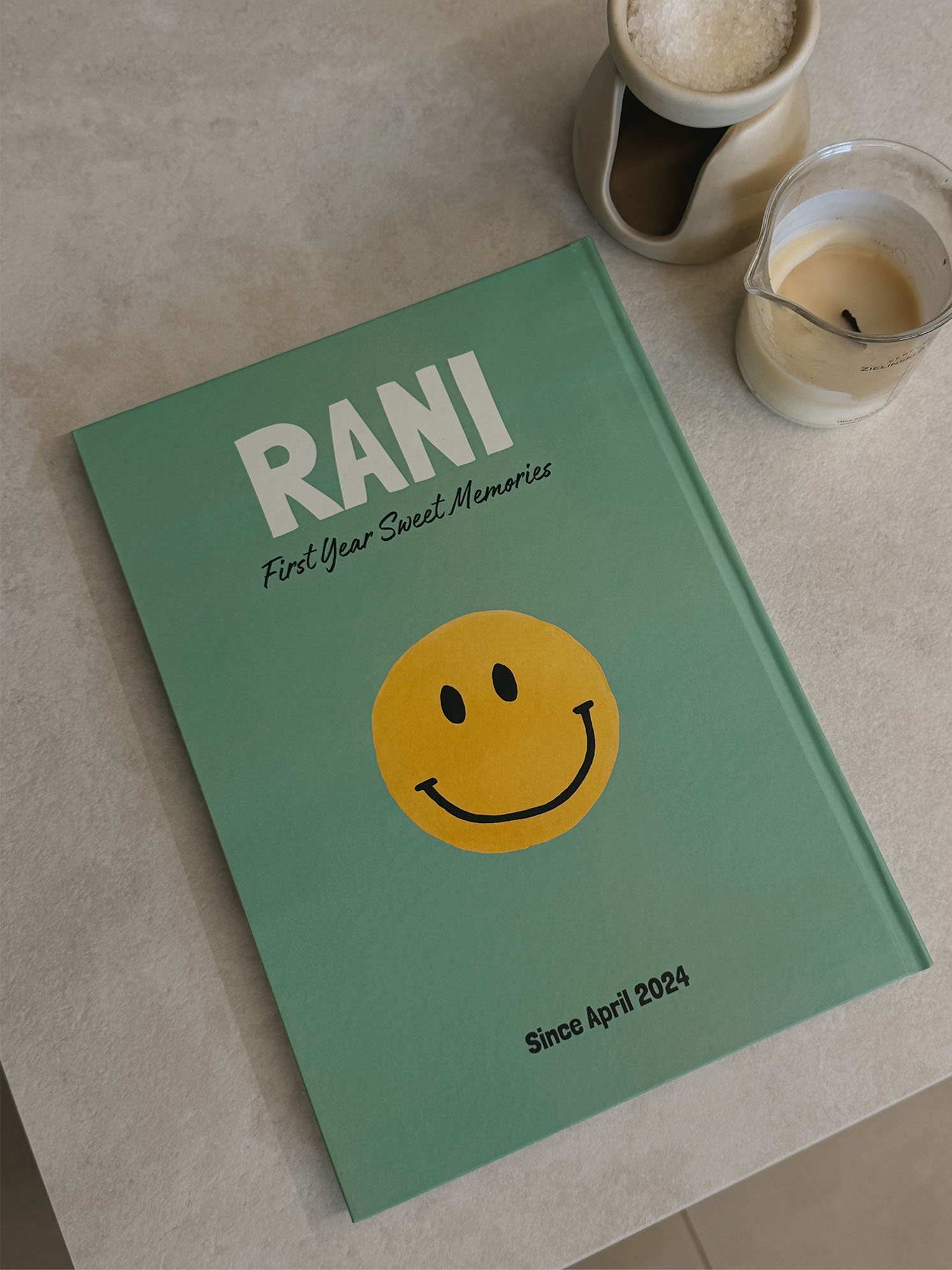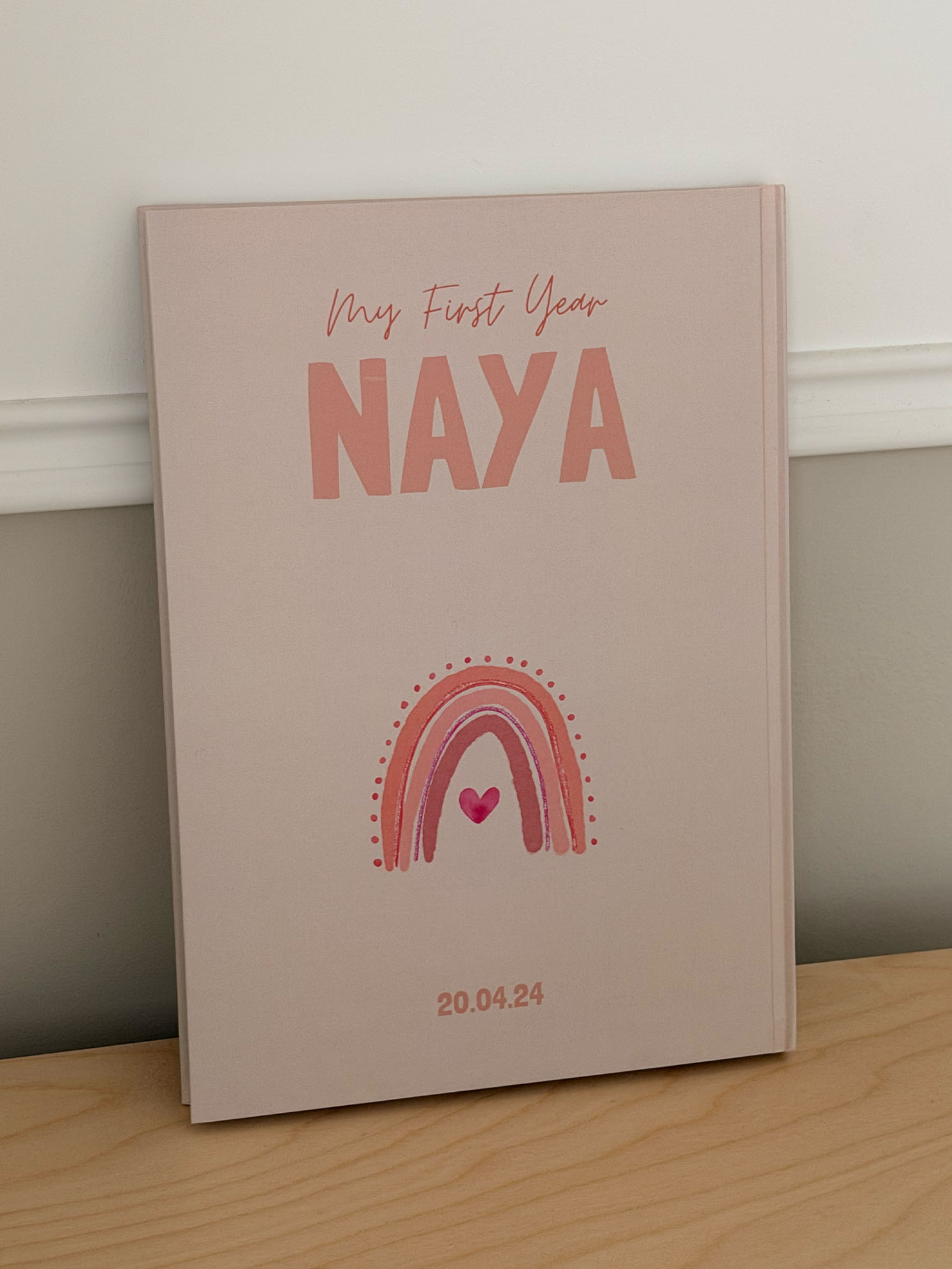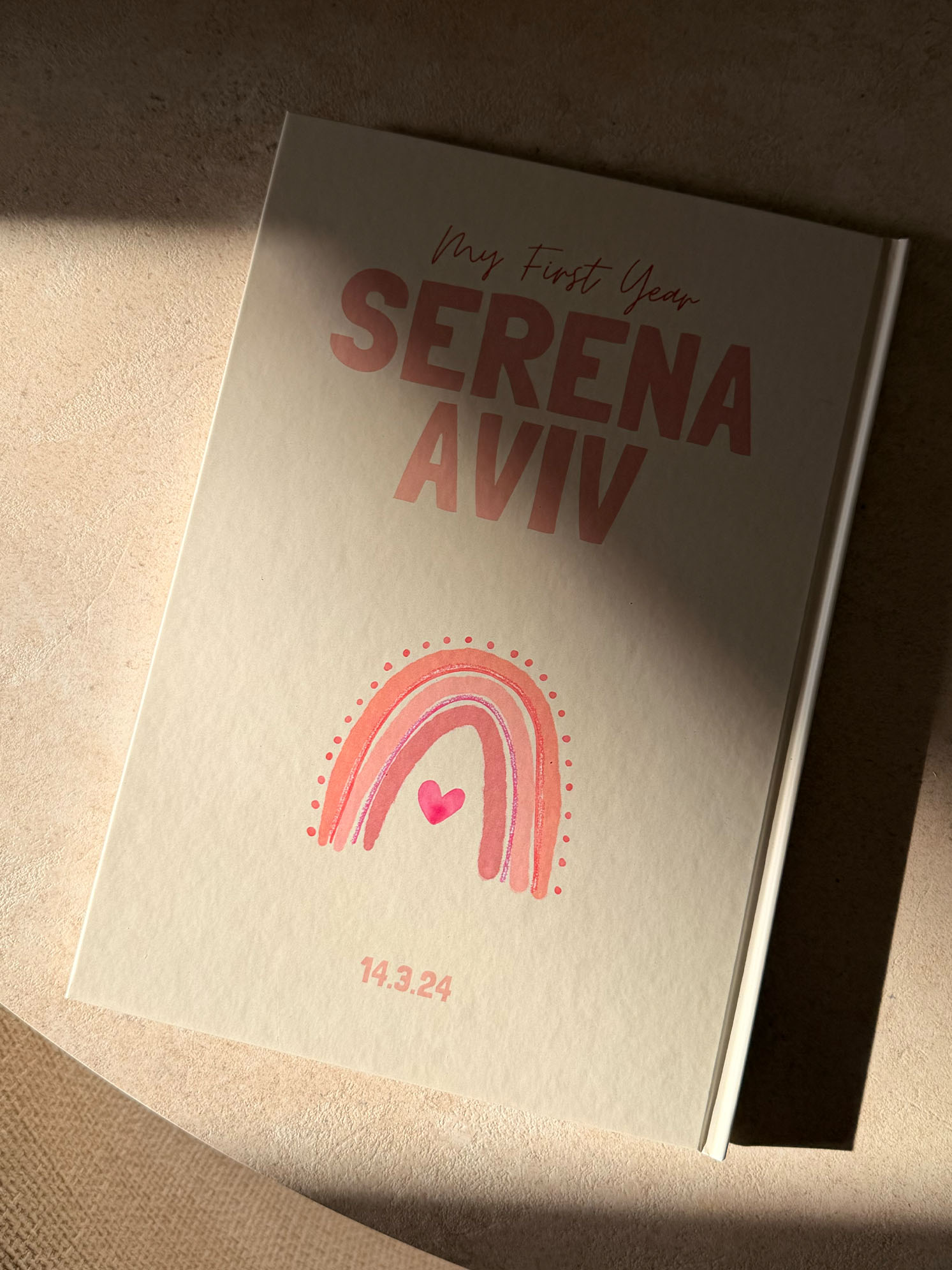 אלבום השנה הראשונה שלי בגודל A4, מעוצב בהתאמה אישית ומתעד את כל תהליך הגדילה המרגש של הבייבי – מהרגעים הראשונים אחרי הלידה ועד גיל שנה.